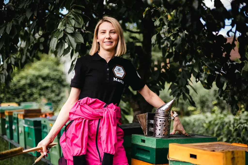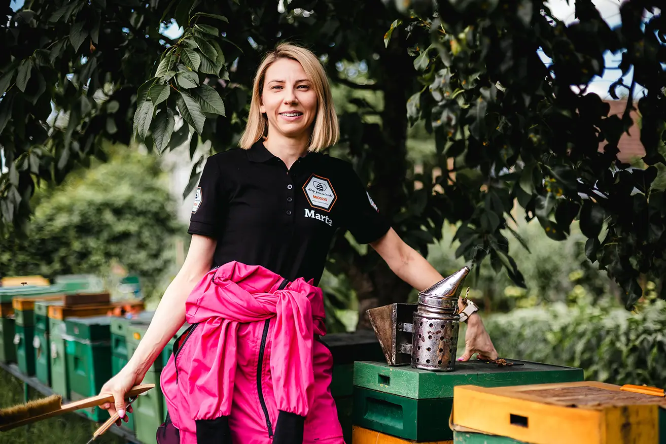 Mam na imię Marta i jestem zawodowym pszczelarzem z dyplomem Technikum Pszczelarskiego w Pszczelej Woli. Wraz z mężem Marcinem prowadzimy sklep pszczelarski, w którym oferujemy miody i produkty prosto z rodzinnej pasieki mojego taty i brata.
