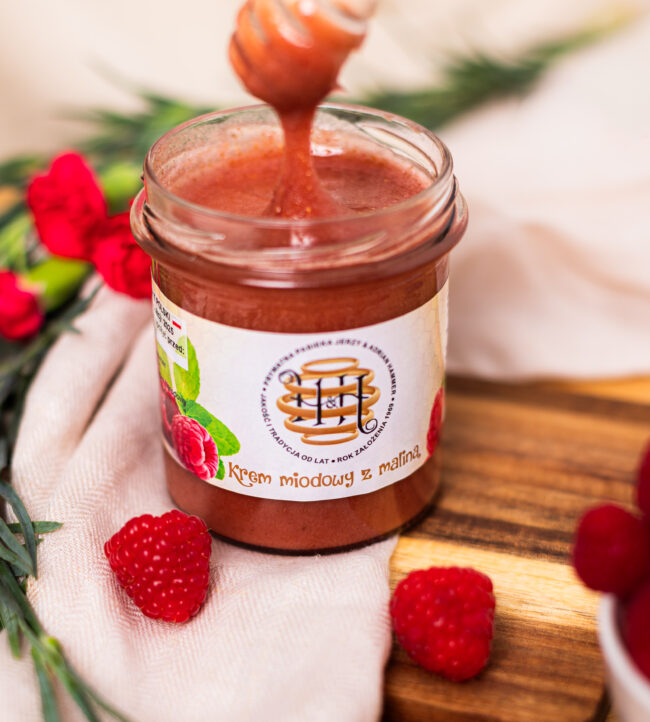 Aksamitny krem miodowy z maliną to połączenie miodu wielokwiatowego z maliną liofilizowaną.