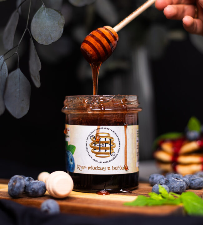 Krem miodowy z borówką to połączenie miodu wielokwiatowego z borówką amerykańską liofilizowaną.