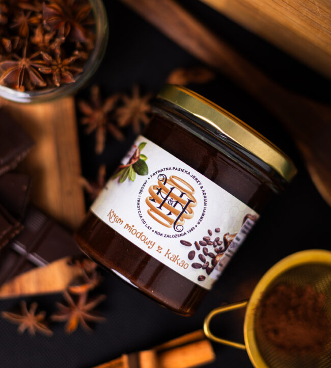 Aksamitny krem miodowy z kakao to połączenie miodu wielokwiatowego z czarnym kakao.