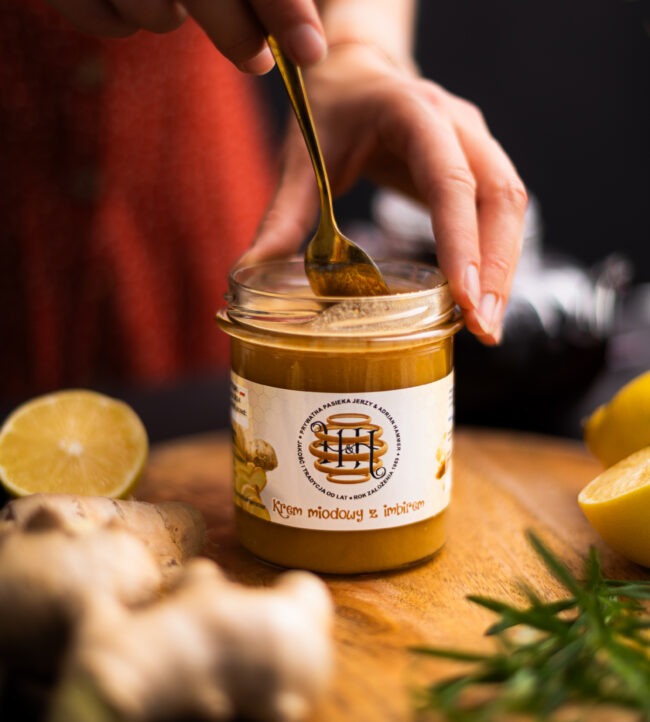 Krem miodowy z imbirem to połączenie miodu wielokwiatowego z imbirem liofilizowanym.